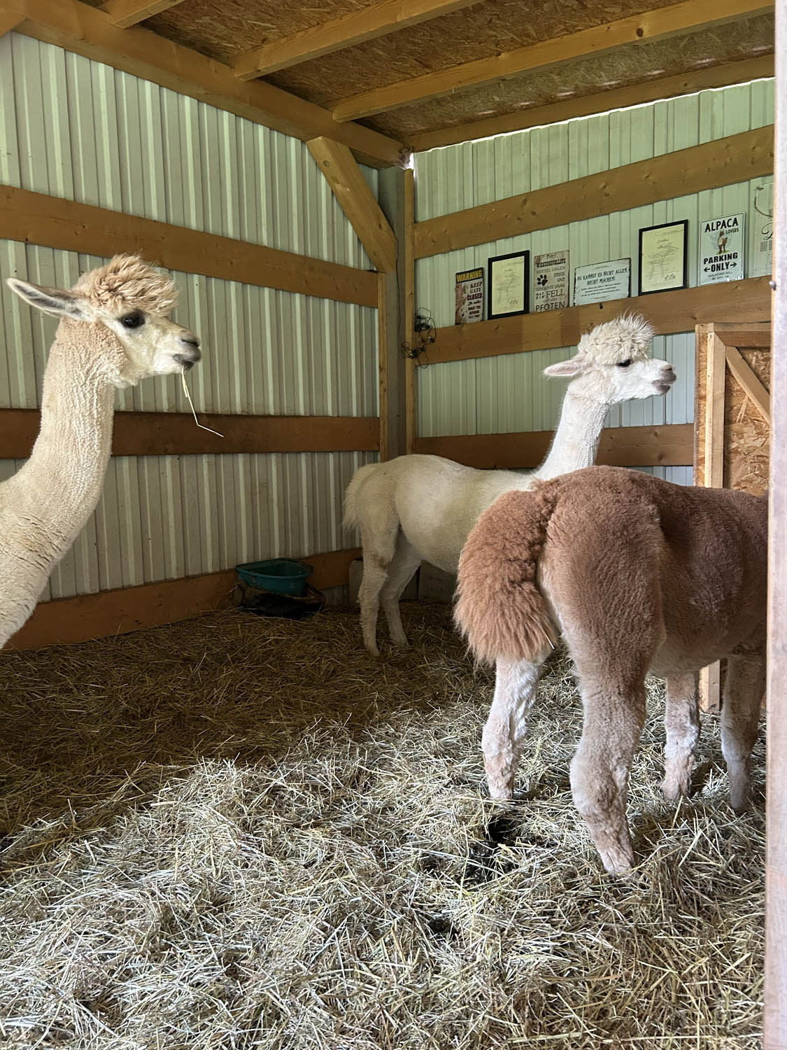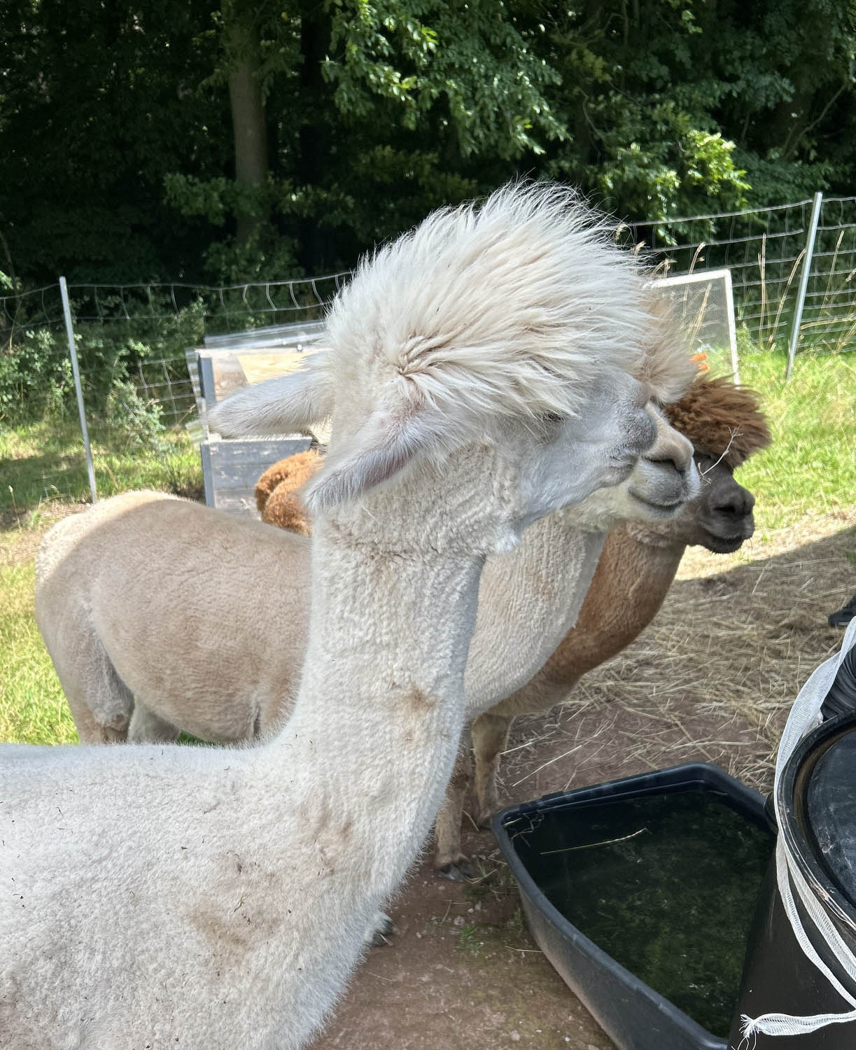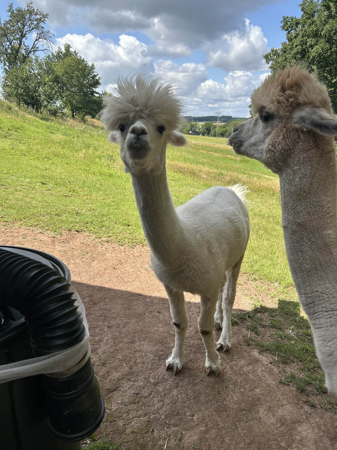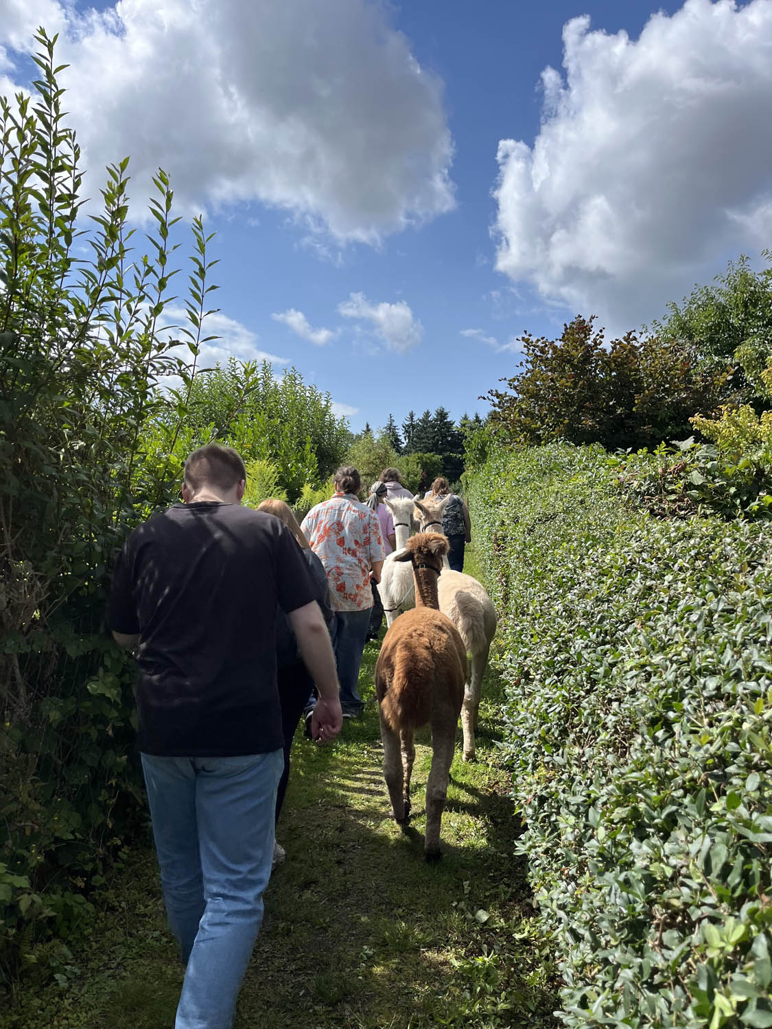 Während der Wanderung erfuhren die Teilnehmenden viel über die Zucht und die Haltung von Alpakas und zu den Persönlichkeiten der drei Tiere. Die Tour verlief über Wiesen mit schmackhaftem Klee für die Vierbeiner, Waldwege und Wiesenränder. Kurz vor dem Ziel brauchte das Alpaka Felix noch eine Rast. Am Rande der Straße legte er sich einfach für ein paar Minuten auf den Asphalt.